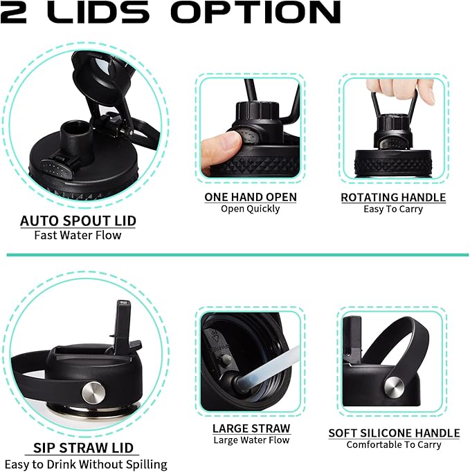 • 2 LIDS—100% Leak Proof: the auto spout cap & straw lid provide your different drinking experience. The ONE-HAND operation pop-up spout lid for convenient enjoy your fast water flow. The SPILL-PROOF straw lid with high flow rate & BPA free. Both 2 lids design with a sturdy handle, making the insulated water bottle more convenient to carry