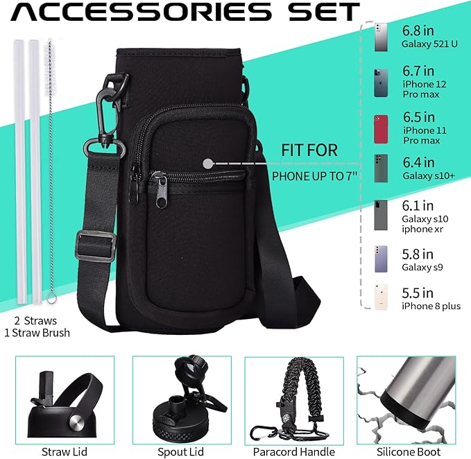 • COMBO—Super Deal: Buy 40 oz water bottle and get 9 accessories (2 x lids, 1 x survival paracord, 1 x carrying pouch, 1 x shoulder strap, 1 x protective cup mat, 2 x straws, 1 x straw brush). WITH A LIFETIME GUARANTEE, these thermal water bottles are the perfect gift for use at home, work, school, road trips, hiking, sporting events, or just hanging out