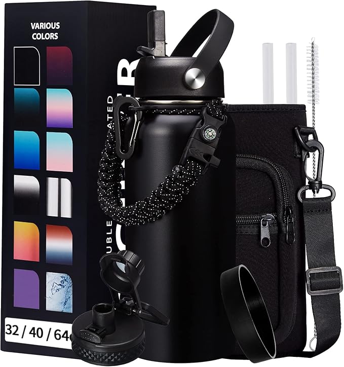 • SUPER JOYFUL COMBO: Buy 32oz insulated water bottles and get 9 accessories (2 x lids, 1 x survival paracord, 1 x carrying pouch, 1 x shoulder strap, 1 x protective cup mat, 2 x straws, 1 x straw brush). WITH A LIFETIME GUARANTEE, these thermal water bottles are perfect gifts for using at home, work, school, road trips, hiking, sporting events, or just hanging out