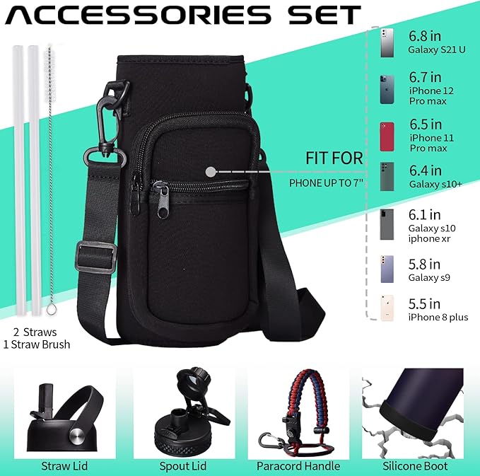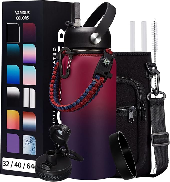 • SUPER JOYFUL COMBO: Buy 32oz insulated water bottles and get 9 accessories (2 x lids, 1 x survival paracord, 1 x carrying pouch, 1 x shoulder strap, 1 x protective cup mat, 2 x straws, 1 x straw brush). WITH A LIFETIME GUARANTEE, these thermal water bottles are perfect gifts for using at home, work, school, road trips, hiking, sporting events, or just hanging out