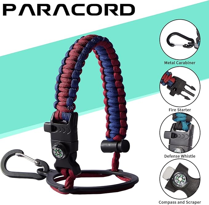 • UNIQUE PARACORD HANDLE: Bright color paracord matches the flask water bottle to give you a youthful vibe while adding a personal style. With a compass, safety loop, metal carabiner, flint, igniter and whistle to become your survival tool, making the 32 oz stainless steel water bottle with paracord an ideal survival kit for expeditions in the wild