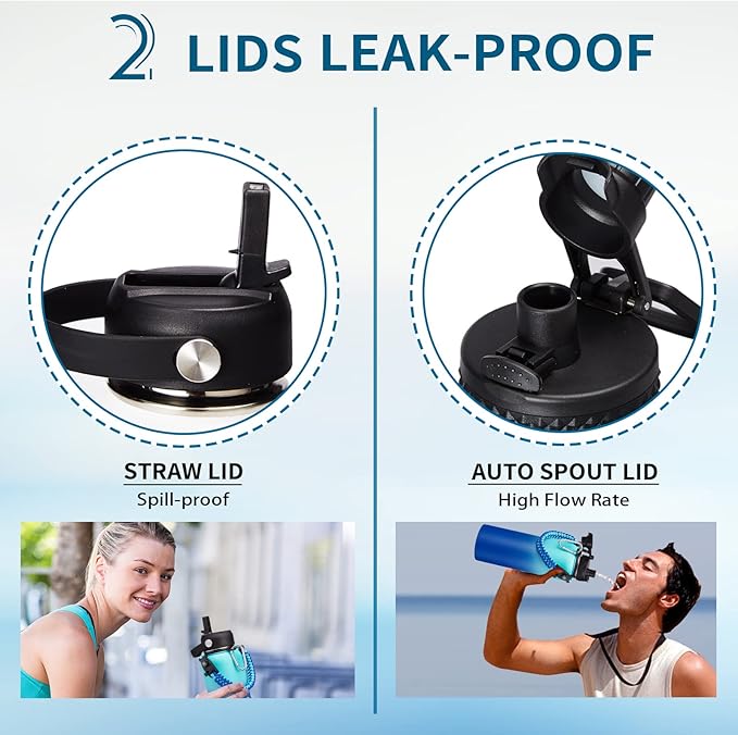 • LEAK-PROOF 2 LIDS - AUTO SPOUT LID & STRAW LID meet you different drinking need, and both lids are leak proof and with handle for carrying on the go. The pop-up spout lid features a button for one hand open quickly, and a large water outlet for fast drinking. The straw lid with straw lets you enjoy spill-proof sipping to all your outdoor adventures, also can prevent the inhalation of ice cubes