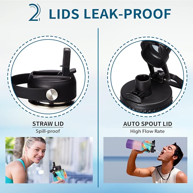 • LEAK-PROOF 2 LIDS - AUTO SPOUT LID & STRAW LID meet you different drinking need, and both lids are leak proof and with handle for carrying on the go. The pop-up spout lid features a button for one hand open quickly, and a large water outlet for fast drinking. The straw lid with straw lets you enjoy spill-proof sipping to all your outdoor adventures, also can prevent the inhalation of ice cubes