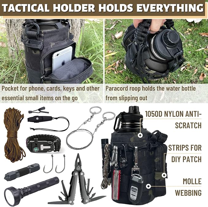 • Tactical Sports Bottle with Holder ◊ The lid with handle, the paracord handle on the water bottle sleeve, and the detachable shoulder strap provide you with a variety of carrying options and travel convenience. The front pocket can hold your cell phone, keys, and other essentials. The Mollo system offers more possibilities to carry more things with you.