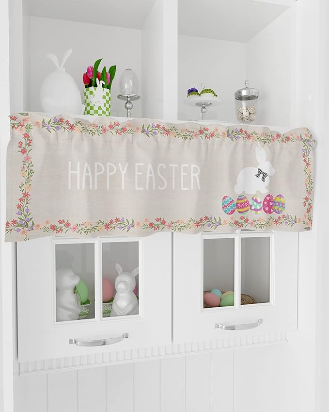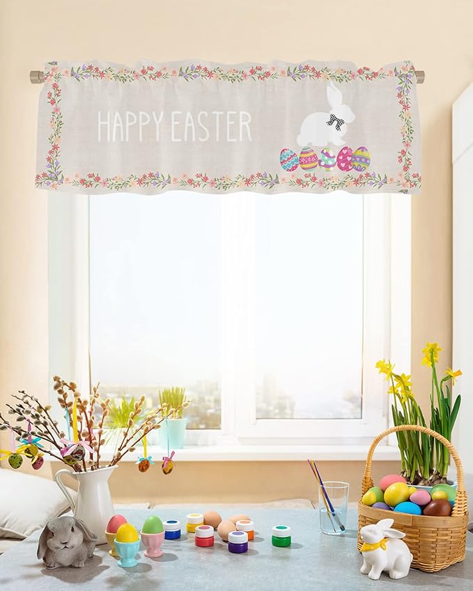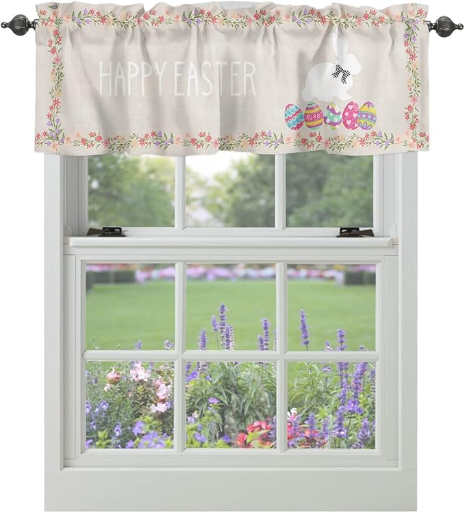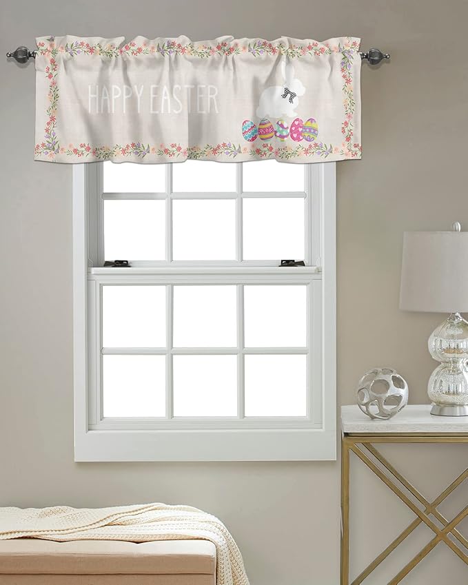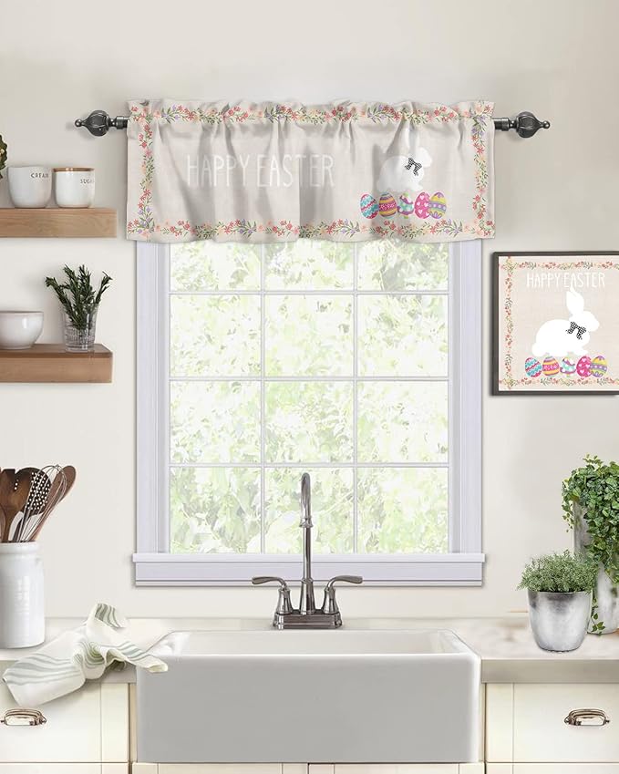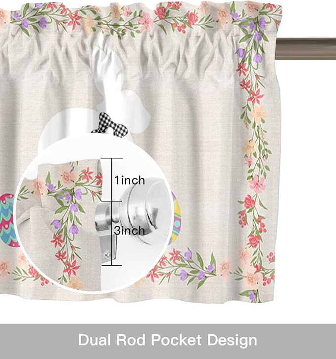 • Rod Pocket Easter Day Kitchen Curtains for Windows:Made Of 100% Polyester,This Window Toppers Can Decorate Your House&Cafe,Reduce Lights And Provides Shade,With Built-In Pocket,It Fits Decorative Window Drapery Rods Up To 3" In Diameter With 1" Header