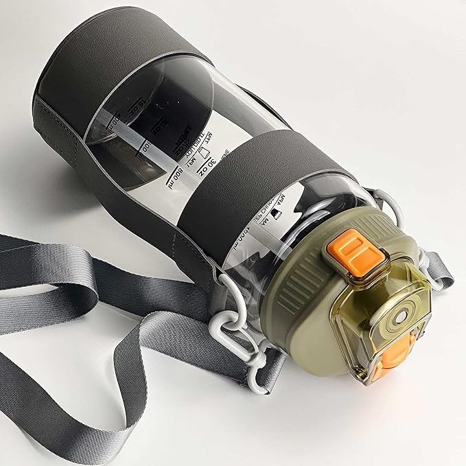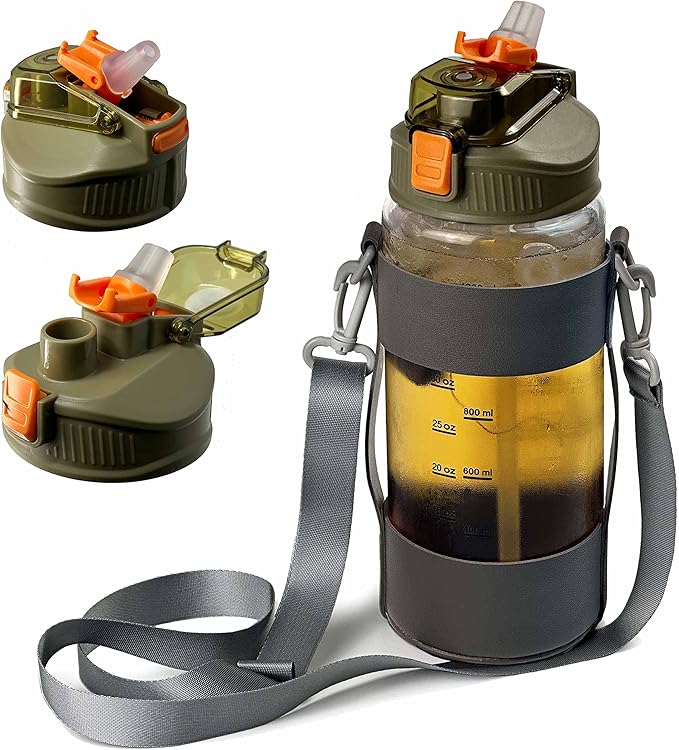 48oz Borosilicate Glass Water Bottle with Straw and Time Marker, Large Sport Water Jug with Adjustable Strap for Men Women (Green)