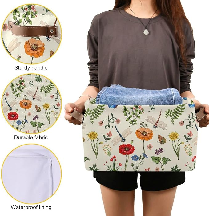 Spring Flowers Herbs Dragonfly Storage Basket Fabric Laundry Baskets Sunflower Lavender Daisy Storage Boxes Organizer Bag for Baby Cloth Dog Toy Book Storage Cubes Shelf Closet Bins 16x12x8 Inches