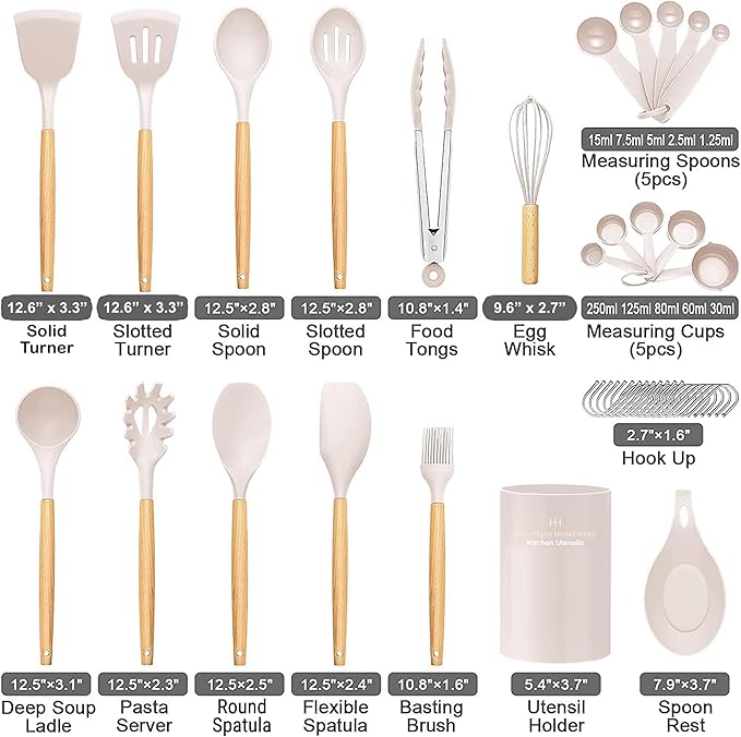 • COMPLETE KITCHEN UTENSIL SET - The ultimate 33 piece silicone kitchen utensil set, designed to meet all your cooking and baking needs! This comprehensive set includes all the essential cooking tools, such as spoons, spatulas, turners, ladles, tongs, whisks, measuring cups and more. This versatile set is ideal for both novice and professional chefs and makes a perfect housewarming or wedding gift.