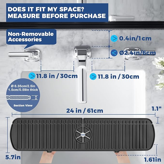 • That there must be no obstructions within a length of at least 11.8 inches on the left and right sides of the faucet. Otherwise there is not enough space to put silicone faucet handle drip catcher tray.