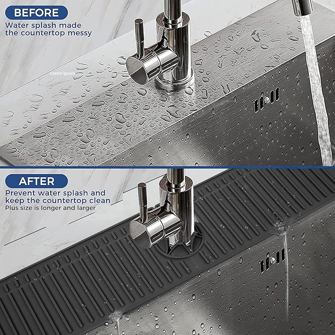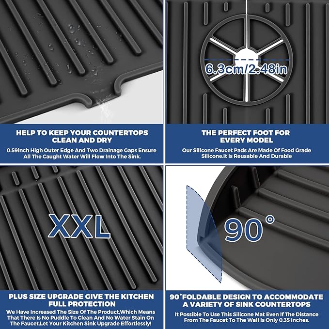 • 💪【XXL PLUS SIZE】 XXL Size: 24"(61cm) x 5.55"(14.1cm) , Ø 2.48"(6.3cm) Diameter single faucet hole. Unlike other products, we have increased the size and weight of our products. XXL super size design for faster, smoother drainage and faster drying. Upgraded supersize, wider space protection, this means no puddles to clean up & no water spots by the faucet. Give your kitchen sink an effort-saving upgrade!