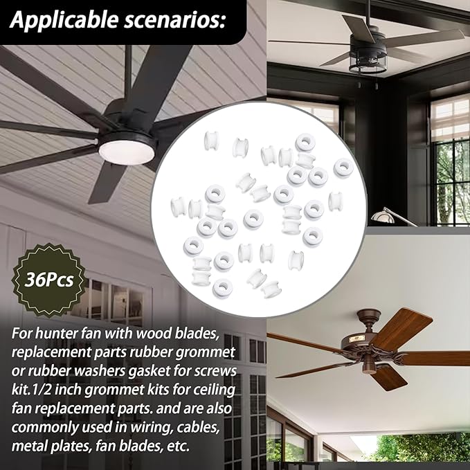 • √【Applicable scenarios】:For hunter fan with wood blades, replacement parts rubber grommet or rubber washers gasket for screws kit.1/2 inch grommet kits for ceiling fan replacement parts. and are also commonly used in wiring, cables, metal plates, fan blades, etc.
