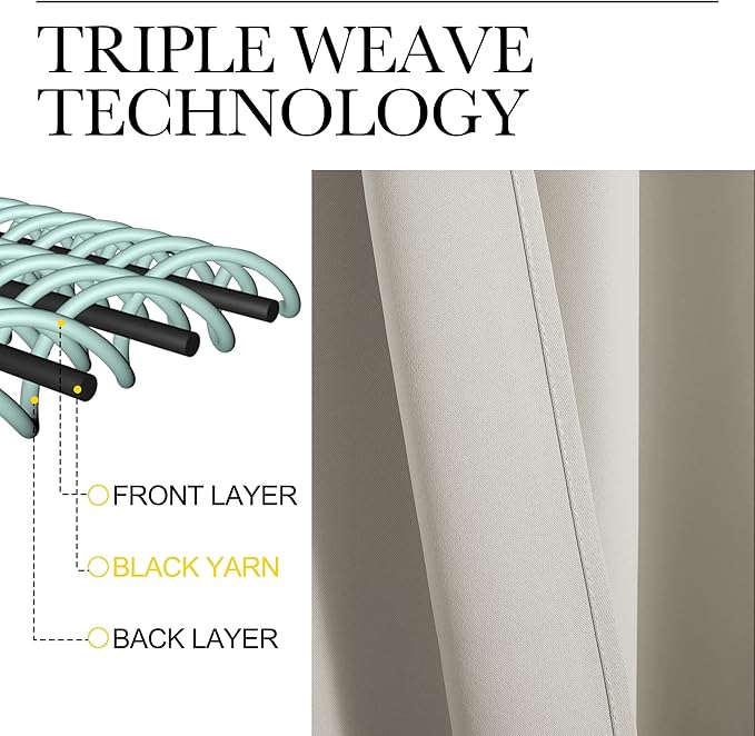 • MULTI-FUNCTION: Super heavy and soft Blackout Curtain Panels are very upmarket. Besides, 85%-99% light blocking, thermal insulated, soundproof, Fade-resistant, energy-efficient. Thread trimmed and wrinkle-free, both sides are the same color.