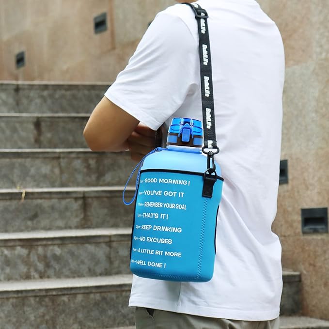 • 【LOCK & ONE BUTTON】QuiFit 1-Button design 1 gallon water jug gives quick easy access to fresh water and saves time and effort. The giant water jug’s opening is sized to fit ice cubes and fruit, the strong nylon strap easy to carry.