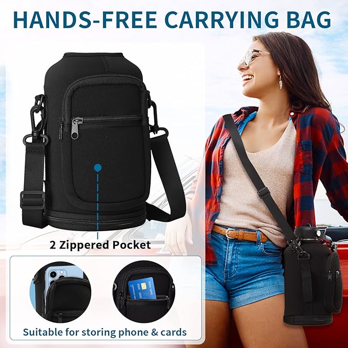 • HANDS-FREE BOTTLE CARRIER BAG & PROTECTIVE BOOT - Stainless steel water bottles with shoulder strap carrier have 2 zipper storage pockets hold your phone, cards, keys. The carrying pouch also provide extra insulation, with the silicone cup mat full-protect the reusable water bottle from additional damage and extend the life of thermo hydro mug