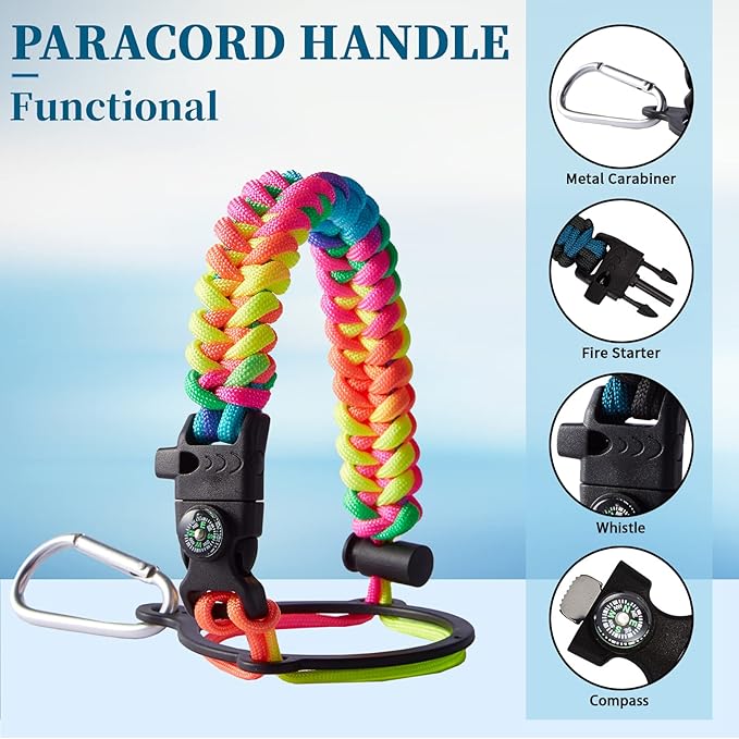 • PERSONALIZATION BOTTLE PARACORD HANDLE - Thermo water bottle with a pretty cool functional paracord handle which does more than meets the eye. The survival strap cord made of military grade nylon, with compass, safety loop, metal carabiner, flint, igniter and whistle. Can help you out if you were in a survival situation while hiking, camping or everyday life