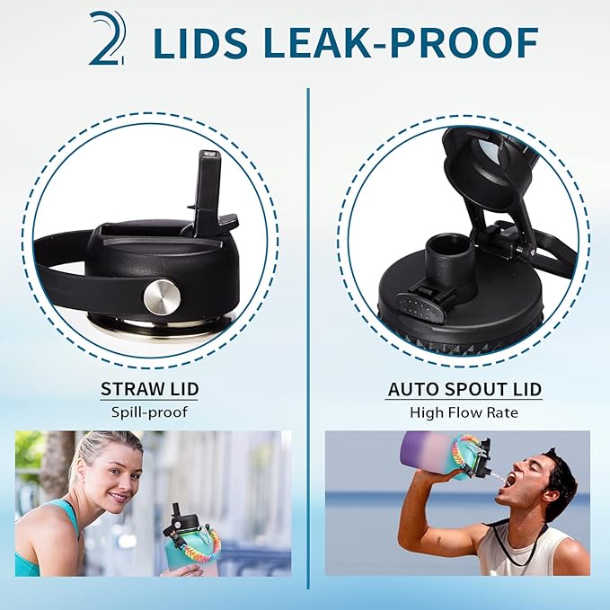 • LEAK-PROOF 2 LIDS - AUTO SPOUT LID & STRAW LID meet you different drinking need, and both lids are leak proof and with handle for carrying on the go. The pop-up spout lid features a button for one hand open quickly, and a large water outlet for fast drinking. The straw lid with straw lets you enjoy perfect spill-proof sipping to all your outdoor adventures, also can prevent the inhalation of ice cubes