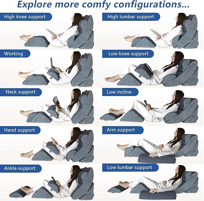 • 【Soft & Supportive Gel Memory Foam】The back pillow, lumbar pillow and the head pillow of the wedge pillow set are made of soft memory foam with gel particles, which ensures comfortable and refreshed even with prolonged use. The base pillow, leg pillow and knee pillow are made of high-density foam, which provides sufficient support and will not deform after long-term use.