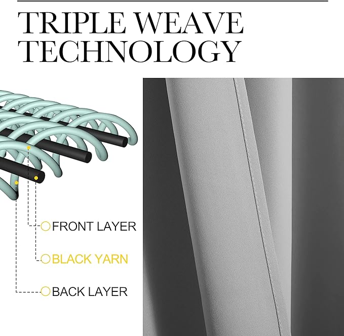 • MULTI-FUNCTION: Super heavy and soft Blackout Curtain Panels are very upmarket. Besides, 85%-99% light blocking, thermal insulated, soundproof, Fade-resistant, energy-efficient. Thread trimmed and wrinkle-free, both sides are the same color.