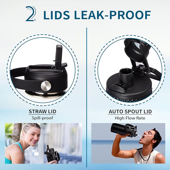 • LEAK-PROOF 2 LIDS - AUTO SPOUT LID & STRAW LID allow you enjoy spill-proof sipping and fast drinking to meet your different drinking needs. The pop-up spout lid is designed for one-hand open and close, with a large water outlet for fast drinking. The spill-proof straw lid makes you easy sip on the go, great to all your outdoor adventures, and also prevent the inhalation of ice cubes
