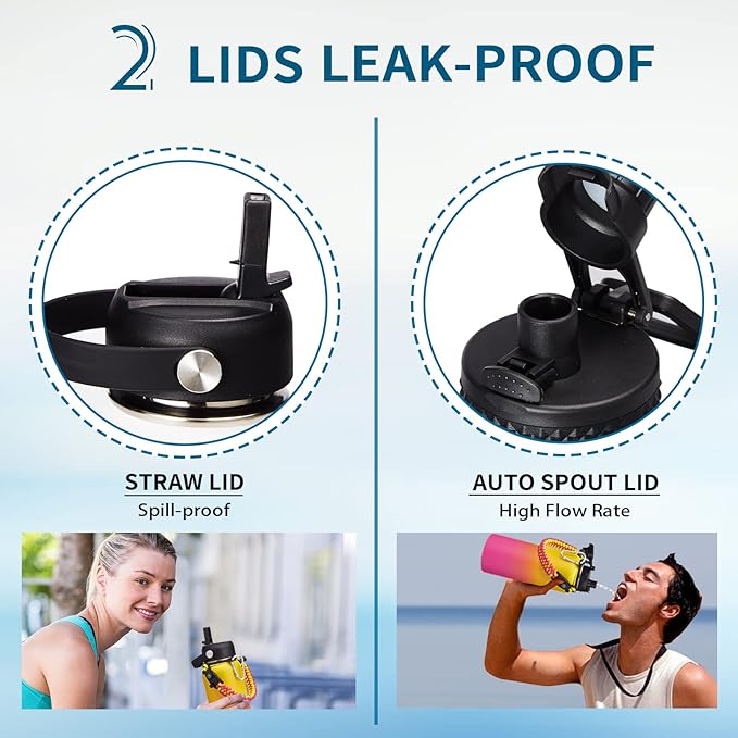 • LEAK-PROOF 2 LIDS - AUTO SPOUT LID & STRAW LID allow you enjoy spill-proof sipping and fast drinking to meet your different drinking needs. The pop-up spout lid is designed for one-hand open and close, with a large water outlet for fast drinking. The spill-proof straw lid makes you easy sip on the go, great to all your outdoor adventures, and also prevent the inhalation of ice cubes