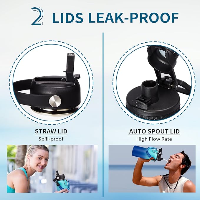 • LEAK-PROOF 2 LIDS - AUTO SPOUT LID & STRAW LID allow you enjoy spill-proof sipping and fast drinking to meet your different drinking needs. The pop-up spout lid is designed for one-hand open and close, with a large water outlet for fast drinking. The spill-proof straw lid makes you easy sip on the go, great to all your outdoor adventures, and also prevent the inhalation of ice cubes