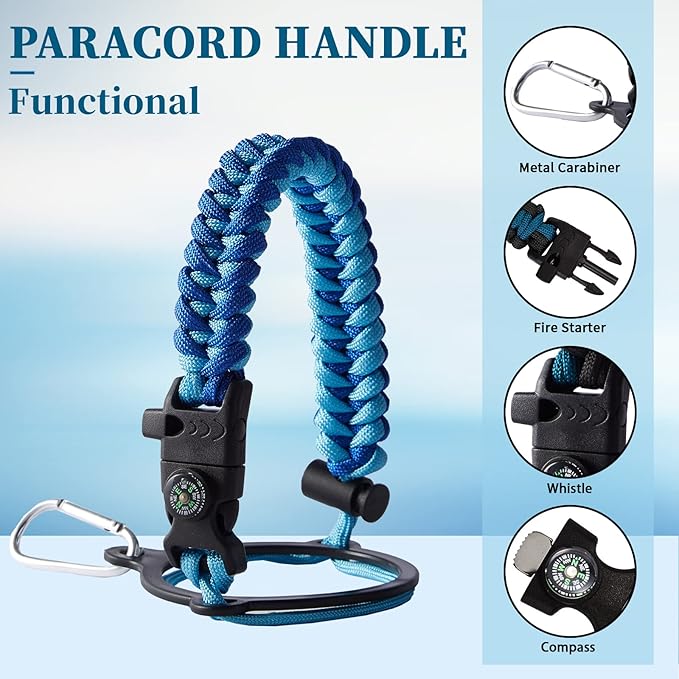 • PERSONALIZATION BOTTLE PARACORD HANDLE - Quarter gallon water bottle with a pretty cool functional paracord handle which does more than meets the eye.?The survival strap cord is made of military-grade nylon and comes with a compass, safety loop, metal carabiner, flint, igniter, and whistle, making it a functional and stylish addition to your thermo water flask, is perfect for outdoor camping, hiking, fitness enthusiasts