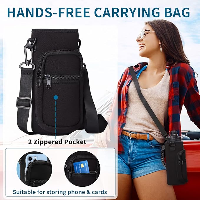 • HANDS-FREE BOTTLE CARRIER BAG & PROTECTIVE BOOT - 32oz stainless steel water bottle with hands-free shoulder carrier bag that features 2 zipper storage pockets to hold your phone, cards, and keys, and the shoulder carrier pouch also provides extra insulation. The protective silicone boot full-protects the reusable water bottle from additional damage and extends the life of thermo water flask bottle