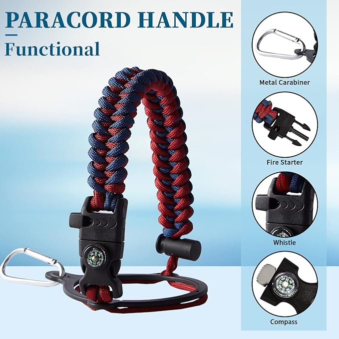 • PERSONALIZATION BOTTLE PARACORD HANDLE - Quarter gallon water bottle with a pretty cool functional paracord handle which does more than meets the eye.?The survival strap cord is made of military-grade nylon and comes with a compass, safety loop, metal carabiner, flint, igniter, and whistle, making it a functional and stylish addition to your thermo water flask, is perfect for outdoor camping, hiking, fitness enthusiasts