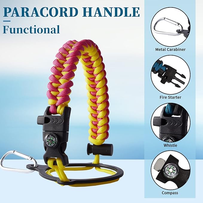 • PERSONALIZATION BOTTLE PARACORD HANDLE - Thermo water bottle with a pretty cool functional paracord handle which does more than meets the eye. The survival strap cord made of military grade nylon, with compass, safety loop, metal carabiner, flint, igniter and whistle. Can help you out if you were in a survival situation while hiking, camping or everyday life