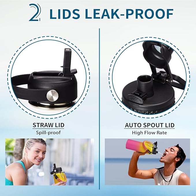 • LEAK-PROOF 2 LIDS - AUTO SPOUT LID & STRAW LID meet you different drinking need, and both lids are leak proof and with handle for carrying on the go. The pop-up spout lid features a button for one hand open quickly, and a large water outlet for fast drinking. The straw lid with straw lets you enjoy spill-proof sipping to all your outdoor adventures, also can prevent the inhalation of ice cubes