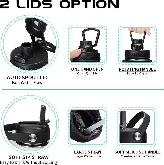 • 2 LID OPTIONS (Auto-spout & Straw): two different lids are complete LEAK PROOF & design for easy drink. The pops-up lid for easy drinking and seals shut for no leaks when you're on the go. The straw lid makes it easy to enjoy spill-proof sips, and package come with a alternative straw & a straw brush for easy cleaning