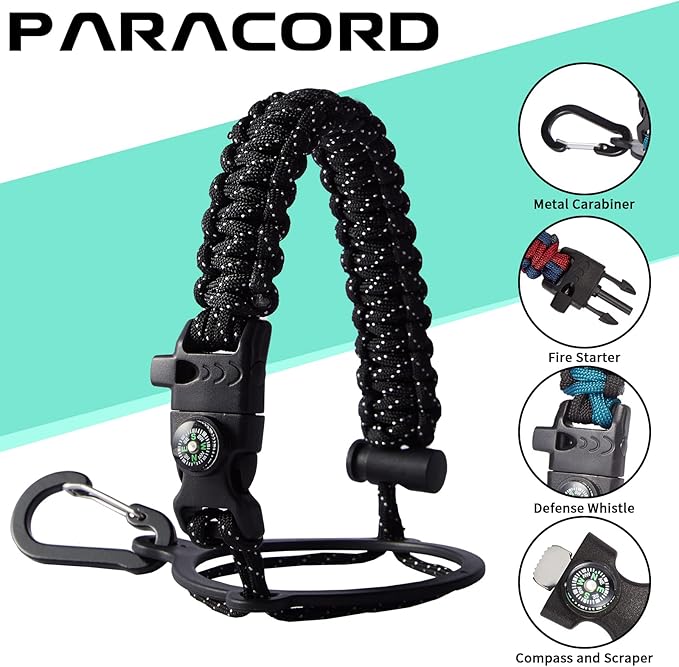 • UNIQUE DESIGNS PARACORD HANDLE: Full-function paracord handle made in individual styles to match the color of the flask water bottles. With compass, safety ring, carabiner, flint fire starter & whistle. It unravels into a sturdy and taut rope in an emergency, making the large water jug an ideal survival kit for expeditions in the wild