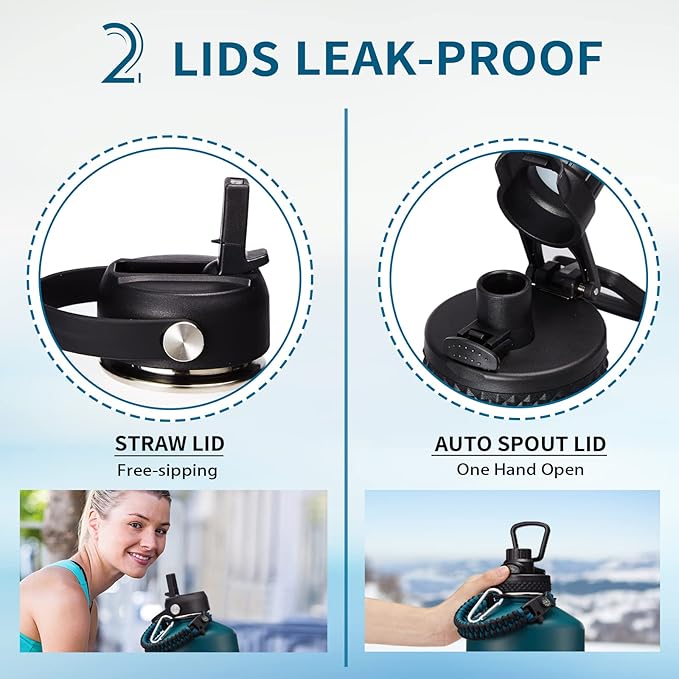 • LEAK-PROOF 2 LIDS - AUTO SPOUT LID & STRAW LID let you can enjoy spill-proof sipping and fast drinking to meet your different drinking needs. The pop-up spout lid is designed for one-hand open and close, with a large water outlet for fast drinking. The straw lid lets you sip on the go, with perfect spill-proof sipping to all your outdoor adventures, and it can also prevent the inhalation of ice cubes