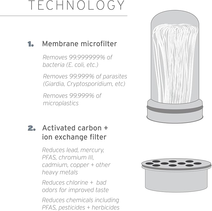 • Product Benefits : Removes bacteria, parasites, microplastics, and various chemicals, while improving taste and reducing the need for single-use plastic bottled water Removes bacteria, parasites, microplastics, and various chemicals, while improving taste and reducing the need for single-use plastic bottled water