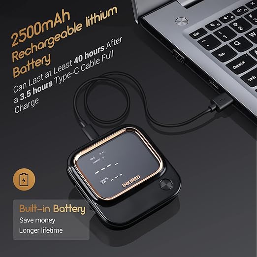 • 【Different Level Deluxe Design & Readable Backlit LCD Screen & Rechargeable 2500mAh lithium Battery】The bbq thermometer with luxury and outstanding design. The screen brightness can be adjusted via the app, the temp data are clear even under the sun. The large LCD screen displays the meat probe readings, ambient/oven temp, the setting temp, high/low temp alarms simultaneously. The built-in battery oven meat thermometer will last at least 40 hours after a 3.5 hours type-C cable full charge.