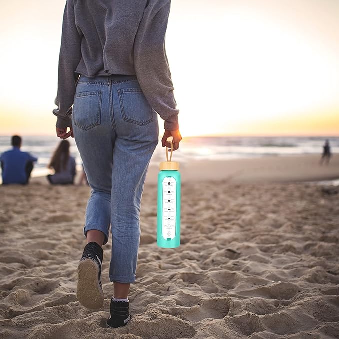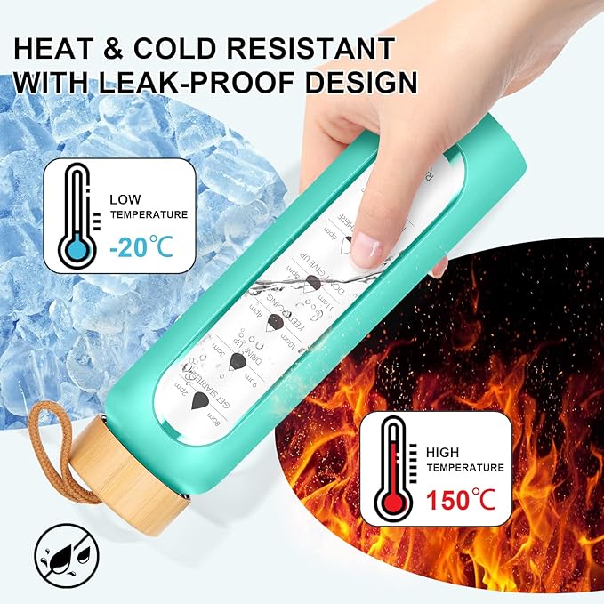 • [Your Ultimate Hydration Partner]: Our clear glass drinking bottle are made of borosilicate glass, which is dishwasher safe, leak proof, BPA, BPS, PVC, lead, and cadmium free. These durable and aesthetic reusable glass time water bottles will not crack under extreme temperature and pressure.