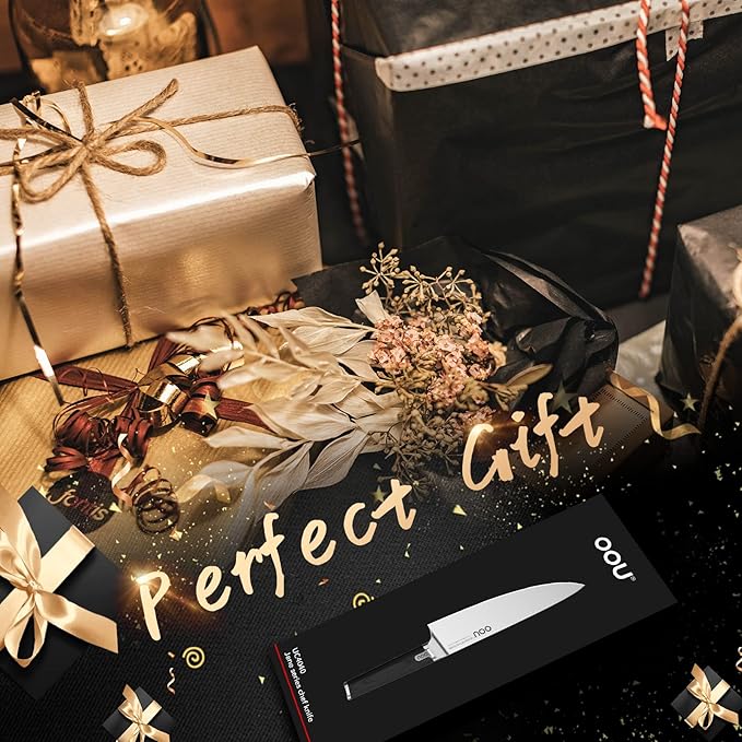 • 【PERFECT QUALITY CHEF KNIFE】OOU 8 inch pro chef's knife is made of premier high carbon German EN1.4116 High Carbon stainless steel with high strength and increased rigidity. Processed with the unique polishing technology, hand polished 12-15°blade angle, the kitchen knives blade tapers from the spine to the cutting edge, for effortless precision cutting, as well as greater stability and durability.