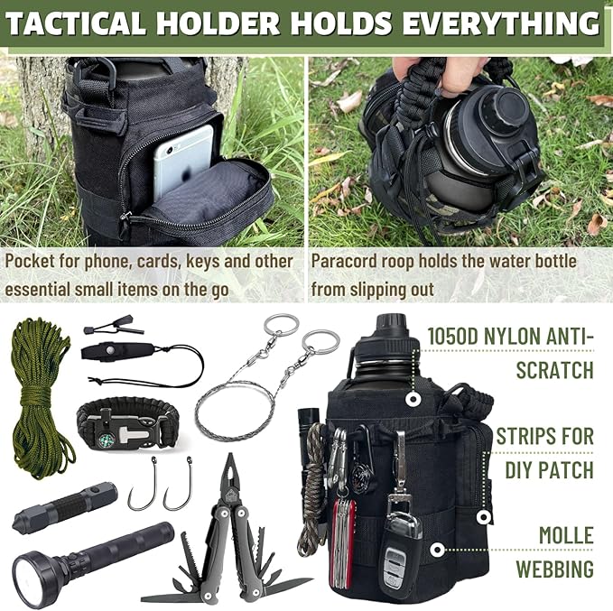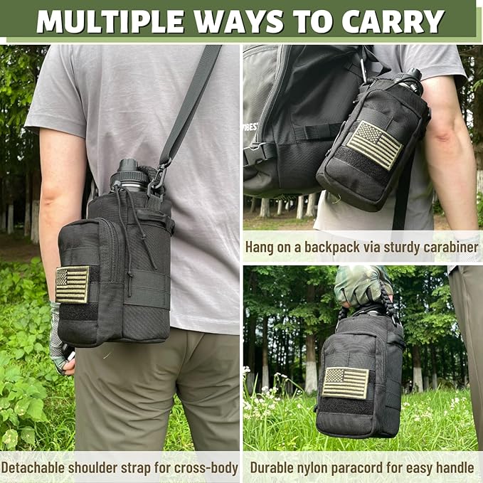 • Tactical Sports Bottle with Holder ◊ The lid with handle, the paracord handle on the water bottle sleeve, and the detachable shoulder strap provide you with a variety of carrying options and travel convenience. The front pocket can hold your cell phone, keys, and other essentials. The Mollo system offers more possibilities to carry more things with you.