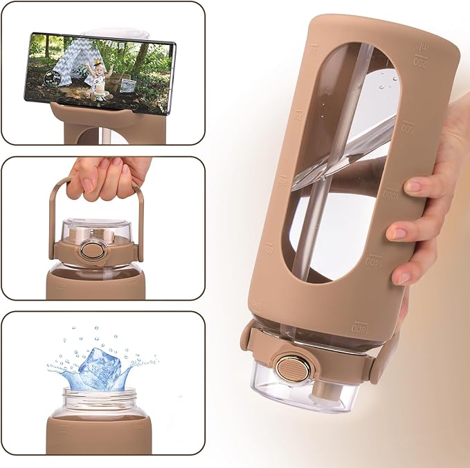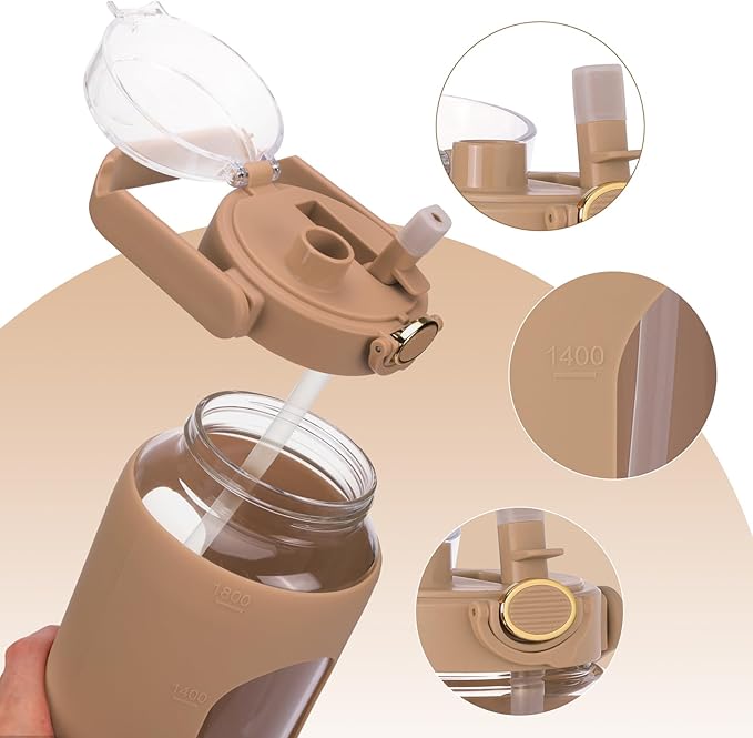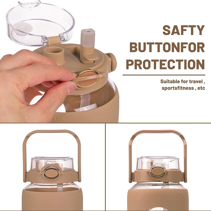 • Glass Water Bottle with Straw: The portable glass bottle with a silicone sleeve also includes 1 sponge brush and 1 Straw brush. The 64oz water bottle with straw has an upgraded dust-proof cover design, a pop-up cover with a silicone O-ring, and a one-touch button that allows you to drink directly or through a straw.
