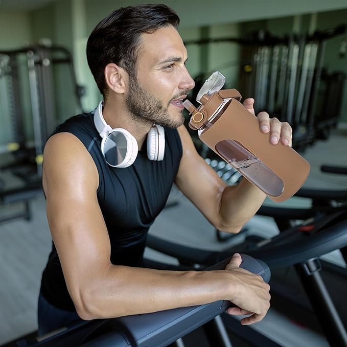 Moretoes 64oz Glass Water Bottle, Glass Bottle with Silicone Sleeve and Time Marker for Gym Home Office (Amber)