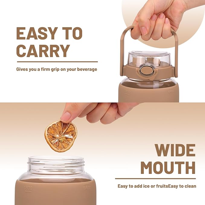 • Design Features: The glass water bottle is designed with a silicone sleeve designed to protect the water bottle while also being easy to grip. Wide-mouthed design facilitates adding fruit and ice cubes, as well as daily cleaning. If you like sports, we have equipped the handle for you to carry easily.