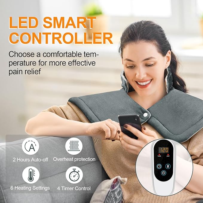 • Extra Large Size & Multi-Purpose: The unisex oversized 17"x23" heating pad provides full and comfortable coverage. Weighted edges with stone help the heating pad drape naturally to better fit the body and Small details of a snap fastener on the shoulders allow the shoulder heating pad to be worn on the body stably and free your hands. You can also wrap it on the waist, abdomen, legs, knee and arms to relieve your muscle soreness and body fatigue.
