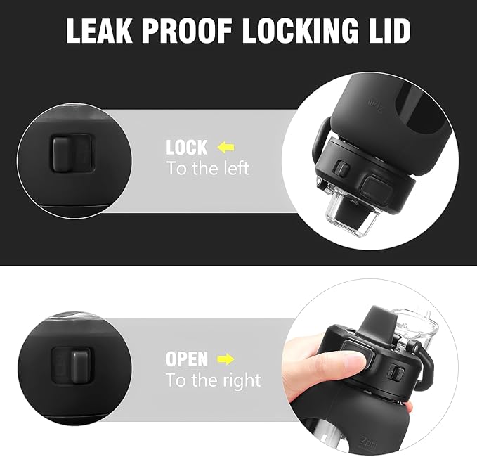 • LOCKING LID & CARRY LOOP - The locking lid ensures no spills while on the go and prevents accidental leakage even the water bottle tip over or be laid on its side. The lid flips open at the push of a button. The carry loop is made from a durable and flexible material that can withstand the weight of the filled bottle and the stress of carrying. Leak-proof lid, soft silicone straw mouth piece and travel friendly soft grip hand.