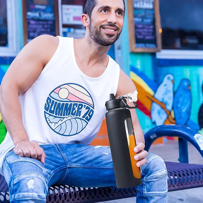 • WINDOWS AND TIME MARKER ON SILICONE SLEEVE - The durable silicone sleeve can provide protection and comfortable grip to protect your glass bottles when in use. The capacity and time markers on silicone sleeve serve as a visual guide, encouraging you to drink water at regular intervals. you can ensure that you stay adequately hydrated and maintain a healthy drinking routine. The windows on the sleeve allow you to see the liquid level inside the bottles.