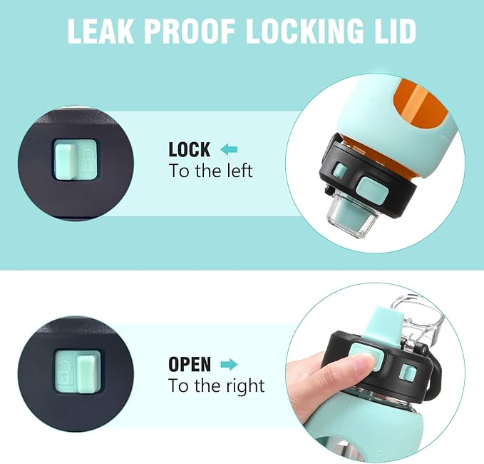 • LOCKING LID & CARRY LOOP - The locking lid ensures no spills while on the go and prevents accidental leakage even the water bottle tip over or be laid on its side. The lid flips open at the push of a button. The carry loop is made from a durable and flexible material that can withstand the weight of the filled bottle and the stress of carrying. Leak-proof lid, soft silicone straw mouth piece and travel friendly soft grip hand.