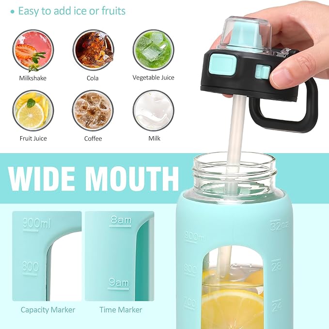 • WINDOWS AND TIME MARKER ON SILICONE SLEEVE - The durable silicone sleeve can provide protection and comfortable grip to protect your glass bottles when in use. The capacity and time markers on silicone sleeve serve as a visual guide, encouraging you to drink water at regular intervals. you can ensure that you stay adequately hydrated and maintain a healthy drinking routine. The windows on the sleeve allow you to see the liquid level inside the bottles.