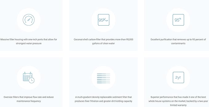 • Powerful Catalytic Carbon Filtration - The radial flow catalytic carbon filter boasts a high-flow design and advanced media blend, efficiently reducing chloramines, chlorine, chemicals, pharmaceuticals, microplastics, sediment, and unwanted tastes and odors.