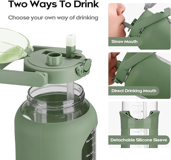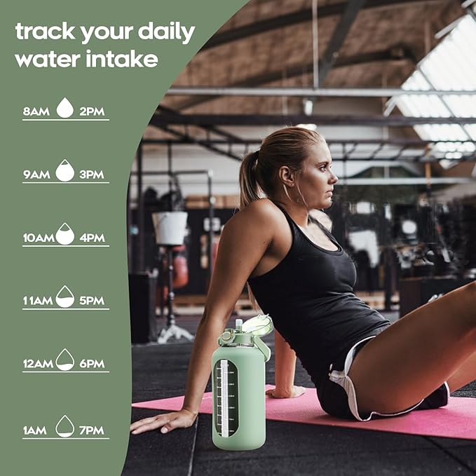 • 【Feature Details】The half gallon(2.2L) water bottle with straw has an anti-slip and high quality silicone sleeve to protect the glass water bottle and help prevent it from being slippery in your hands or slight bumps, it keeps standup stably.In order to make the big gym motivational water bottle easy to carry we have equipped it with handle.