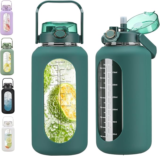 74 oz Glass Water Bolttles with Straw Large Motivational Water Bottle with Time Marker Sports Water Bottles with Silicone Sleeve and Handle Lid 2.2L Water Jug for Gym Workout