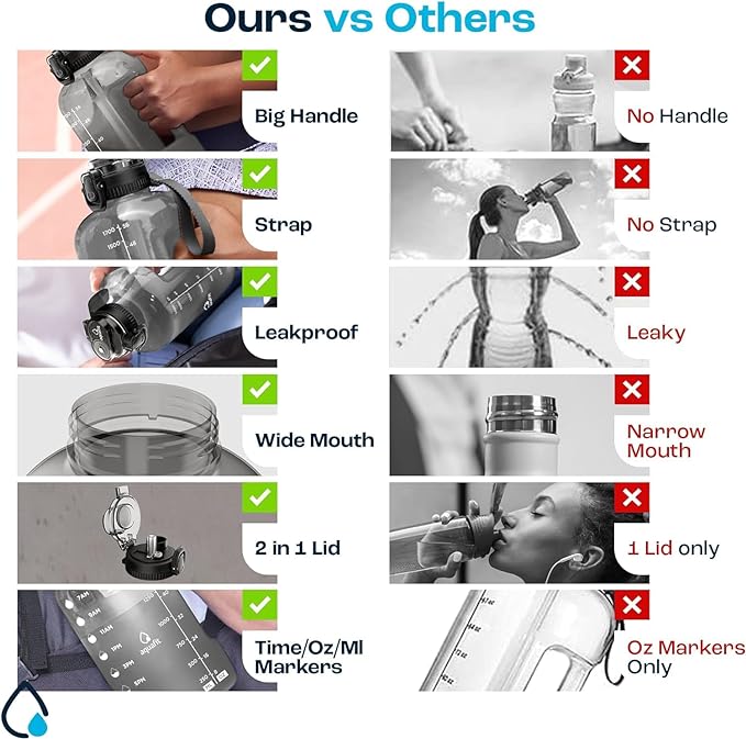 • Track How Much You Drink - Our BPA Free half gallon bottles come with time markers on the side so you can see your daily water intake and stay on track meet your health and fitness goals.